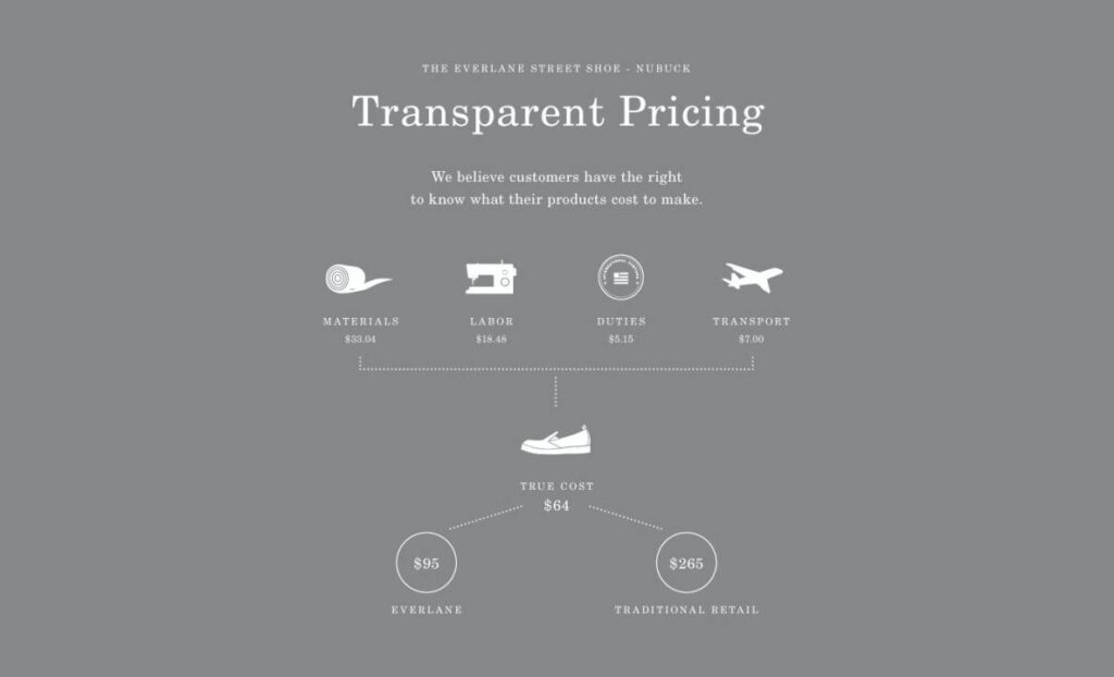 Everlane has built its reputation around “radical transparency”: showing factory details, cost breakdowns, and efforts around sustainable materials.